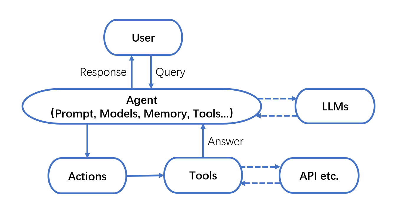 智能体有多种类型。在之前的 LangChain 文档中,我们详细介绍了常用的 ReAct 和 Self-ask with search 等框架。最新的 LangChain 文档还提供了 OpenAI Functions、OpenAI Tools 等类型,这些类型可以帮助构建更加复杂多样的智能体系统。后面的内容将会详细介绍这些智能体系统。