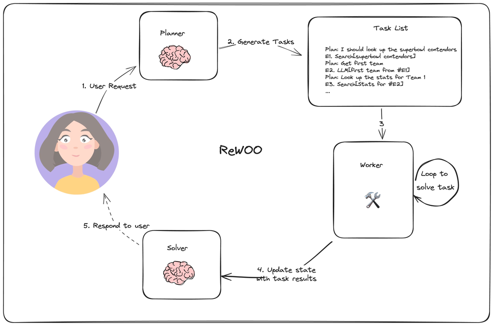 执行者(executer): Plan-and-execute中的single-task Agent、Rewoo中的worker、LLM-Compiler中的Task fetching 单元,均属于执行者职责。主要负责接收规划者输出的子任务列表并进行逐一解决。具体的,Plan-and-execute中的执行者需要大语言模型参与解决子问题;Rewoo中的Worker不需要调用(或只需要轻量级语言模型)LLM进行问题解决;LLM-Compiler中的Task fetching单元利用stream流的格式依据所形成的DAG实现子任务并行。
