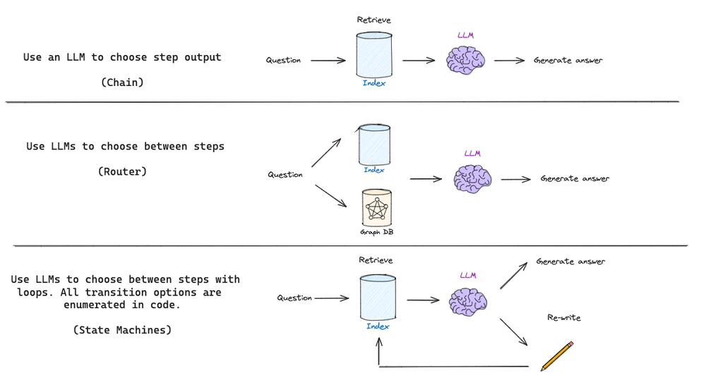 当人们创建更复杂的LLMs应用程序时,例如将循环引入运行时,这些循环通常使用LLMs来推理循环中下一步要做什么。LLMs的一个重要提升是能够将它们用于这些推理任务。这本质上可以被认为是在for循环中运行LLMs。这些类型的系统通常称为智能体。在典型的RAG应用程序中,会调用检索器来返回一些文档。然后这些文档被传递到LLMs以生成最终答案。虽然这通常很有效,但在第一个检索步骤无法返回任何有用结果的情况下,它就会崩溃。在这种情况下,如果LLMs可以推断检索器返回的结果很差,并且可能向检索器发出第二个(更精确的)查询,并使用这些结果,那么通常是理想的。本质上,在循环中运行 LLM 有助于创建更灵活的应用程序,从而可以完成可能未预定义的更模糊的用例。