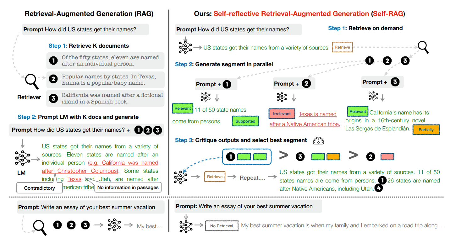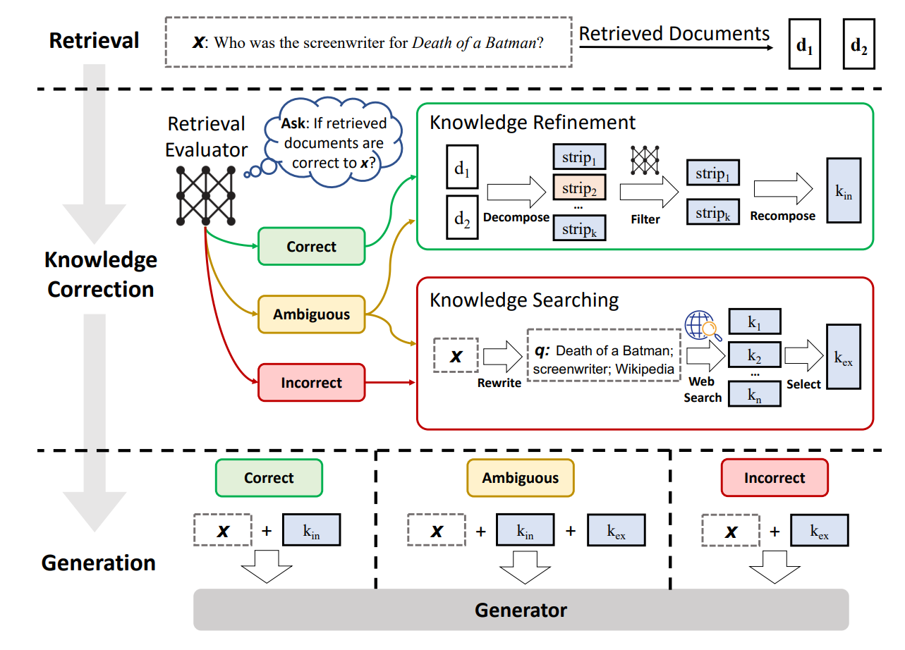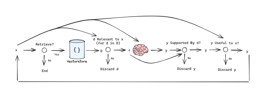 在使用LangChain构造一个基本的RAG流程(如上所示)时,仅仅只需定义一个链(Chain),就可以完成LLM根据检索到的文档确定生成内容的过程。随着RAG技术的发展,RAG本身的流程也日渐复杂,越来越多的独立模块与逻辑分支判断被提出,以满足不同的下游任务需求。例如,当需要使用路由去判断是否应该使用RAG,以及应该使用哪一个RAG检索器时,仅仅定义链已经无法满足任务需要,而往往需要定义一个智能体(Agent)以进行逻辑判断;而当RAG流程进一步复杂,包括了循环、重写、重排序等步骤时,仍然自定义智能体与链已近乎不可能,而使用LangGraph将流表示为图形,实现各种类型的循环和决策无疑能极大的简化这些操作: