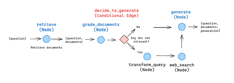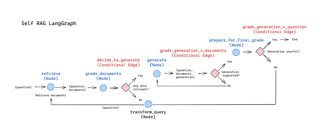 - 根据LangGraph的规则为流程添加节点和边,其中每个节点包含了对状态信息的改变,即RAG的子步骤,而条件边则用于判断下一步应转向哪一个节点;