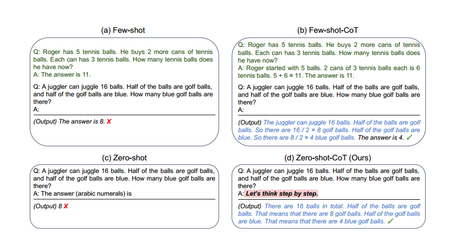 [Kojima et al.,2022] shows that LLMs are decent zero-shot reasoners by simply adding “Let’s think step by step” before each answer in prompting. Experimental results demonstrate that this so called Zero-shot-CoT, using the same single prompt template,significantly outperforms zero-shot LLM performances on diverse benchmark reasoning tasks including arithmetics and other logical reasoning tasks without any hand-crafted few-shot examples.